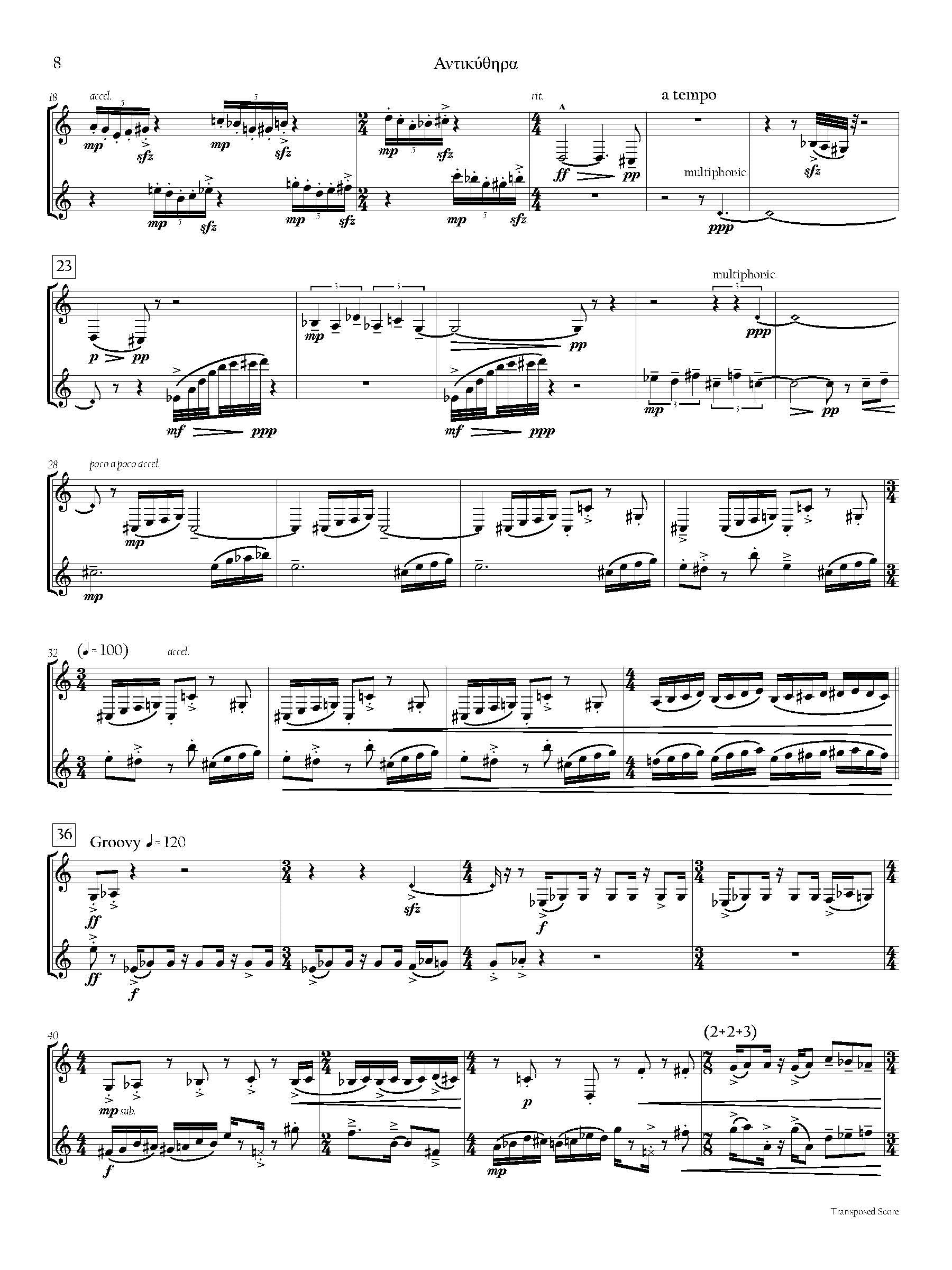 The conception for this study began with the creation of seven different musical fragments. These materials are not motivic or thematic in any sense, but nevertheless, they form the basis for this duet, a unique formation of two different bass voices at play. The piece bubbles and grinds its way at times (as if exploring the deconstructed form of this analog computer) and creates various grooves at other moments, demonstrating the full capacity of the computer's technological power. Ultimately, both basses in this duet converse and improvise off of each other, conjuring up the wonders which comprise the Antikythera mechanism and demonstrating the methods of study, analysis, and research that would continue to be implemented further as technology improved over the centuries worldwide.