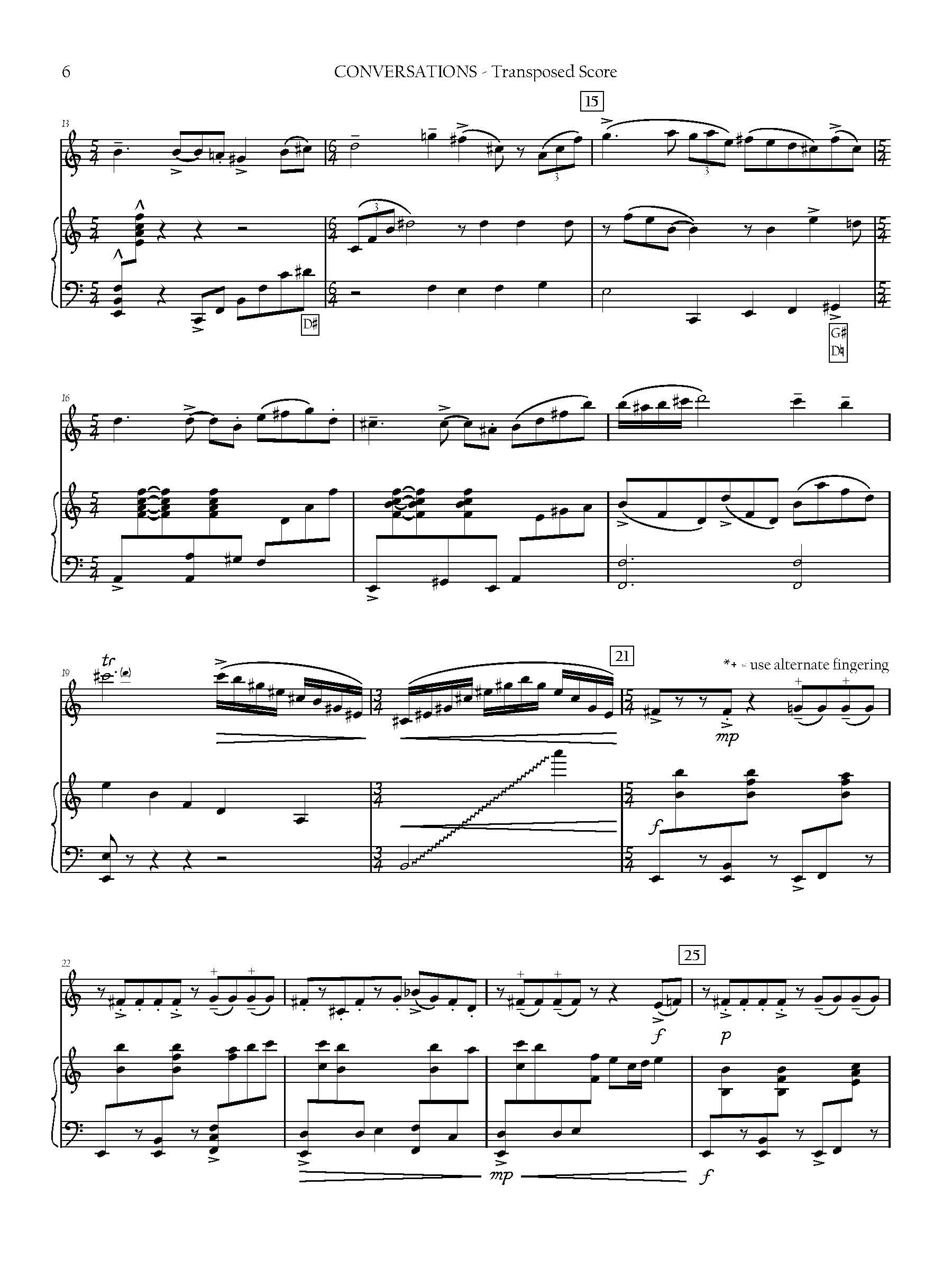 Conversations takes its inspiration from this core, visceral idea, literally and figuratively conjuring up musical conversations between the duet as well as within the essence of the piece itself. The original version of this piece was divided into three separate movements. However, after working with Michelle and Natalie Pate (the harpist) on this piece for the better part of a year, I came to realize that the musical ambitions I initially had could ultimately be fulfilled in its first movement. After numerous revisions and other minor corrections, the revised (and final) version of Conversations is its original first movement.