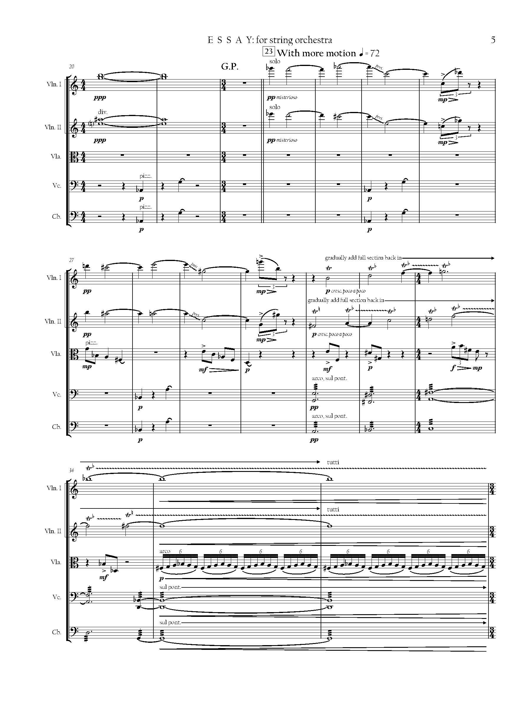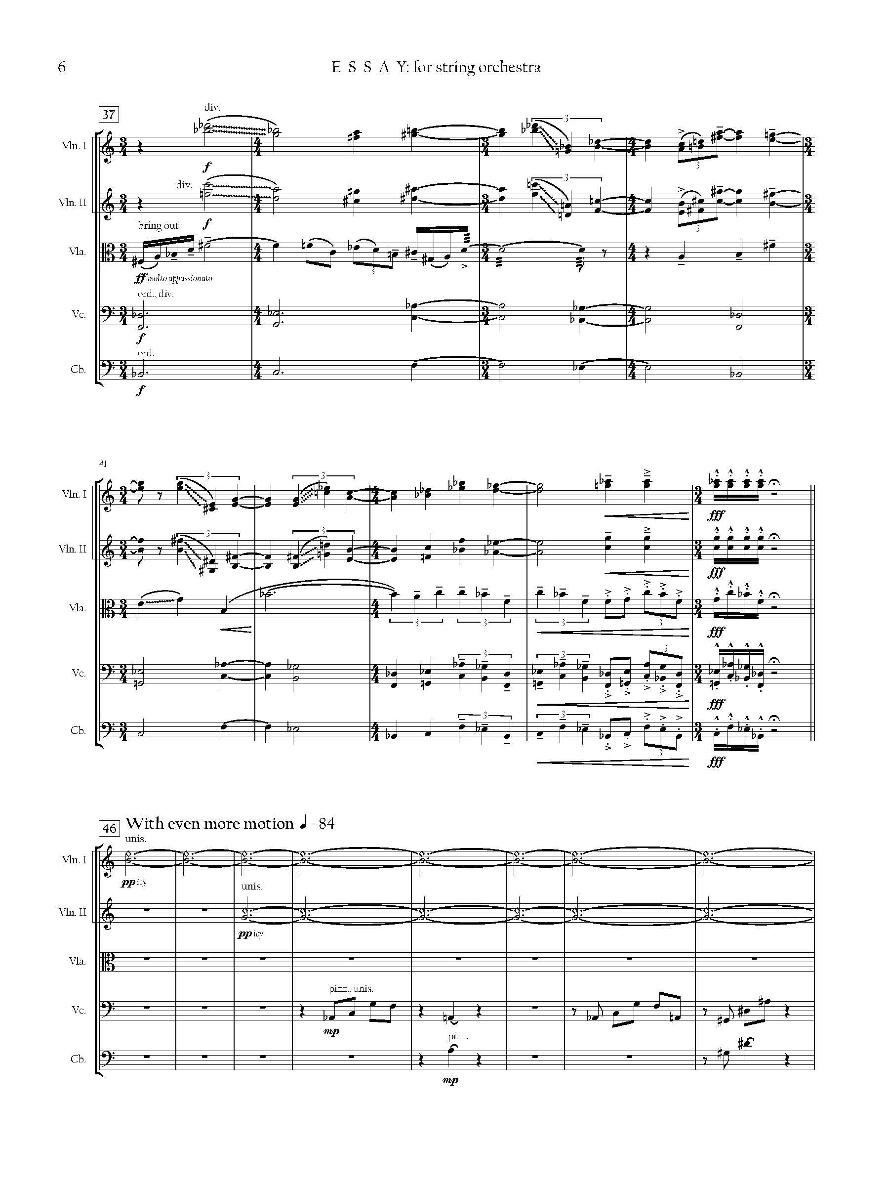 This essay for string orchestra is a one-movement piece which explores darker sonorities and textures alongside relentless percussive and rhythmic activity. Harmonic resonance is often devoid of warmth here; plucking and other such wandering percussive activity gives way to relentlessly rhythmic turbulence; other textures - whether dense or light, rich or muted - are sometimes guided by solos that ultimately meander through uncertainty. The briefest of respites near the end of the essay summons an almost pagan-like aura, as if gazing upon an ancestral past of sorts through an ethereal haze.