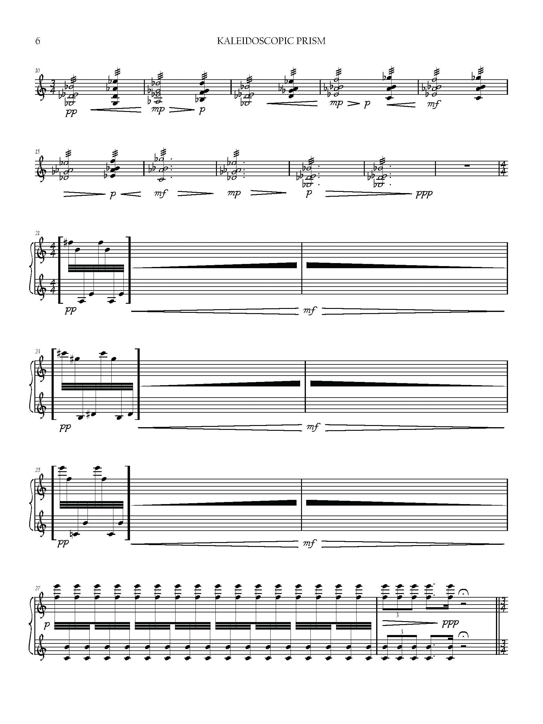 In Kaleidoscopic Prism, the metallic percussion instrument (whether vibraphone or glass marimba) uses ethereal textures, fragmentary harmonies, and murmuring chords to evoke the phenomena of the prism. A larger, flowing section which bridges this material together suggests a ballet-like dance featuring the imagery and effects of the kaleidoscopic prism camera lens, twinkling & wondrous all at once.