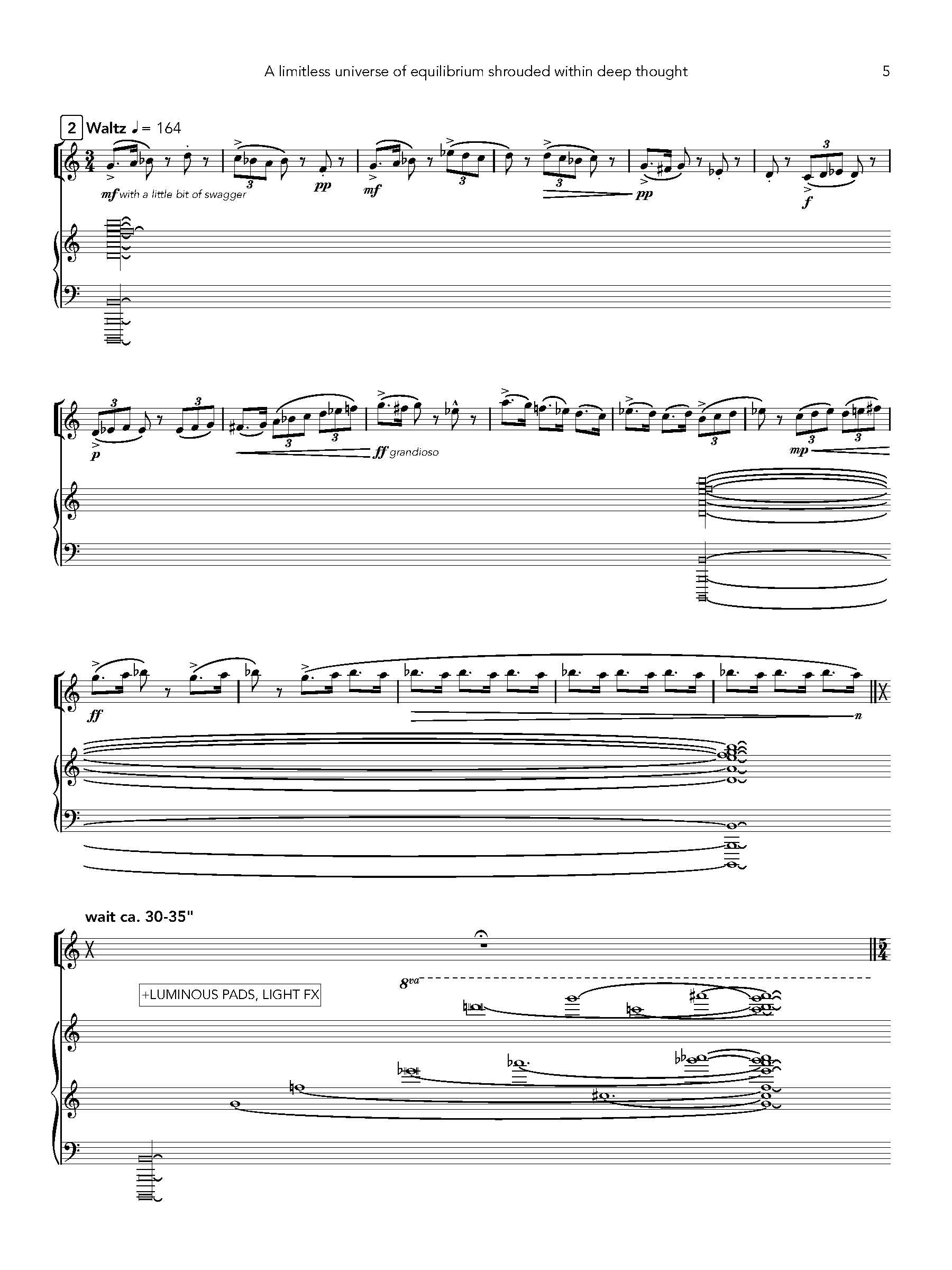 Inspired by the surrealism of Twin Peaks, as well as the art of meditation, this piece functions as a deconstructed dance of sorts. The saxophonist lingers on a waltz that teeters between hesitancy and certainty, represented in the use of the irregular 5/4 meter against the more commonly traditional triple meter (in this case, 3/4 is used). Additionally, this part ebbs and flows alongside an electronic track that conjures an ambient and meditative, yet surreal and unusual, soundscape. As is often the case when dreaming, moments appear and exist, then disappear, whether gradually or suddenly. Some moments linger in memory for a brief while - others are long forgotten and ultimately left behind. Somewhere within all of this, balance can eventually be found (and perhaps achieved), though this is not always the case.