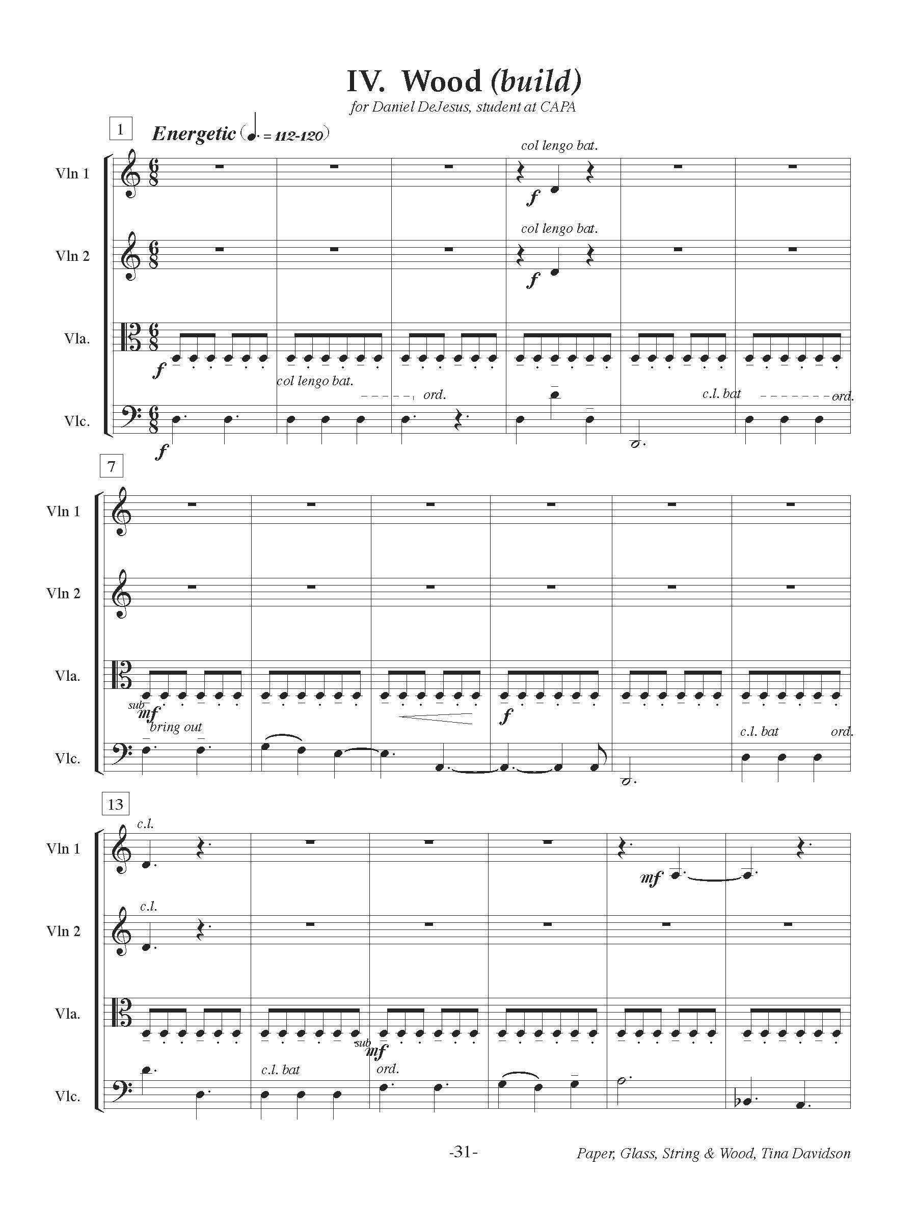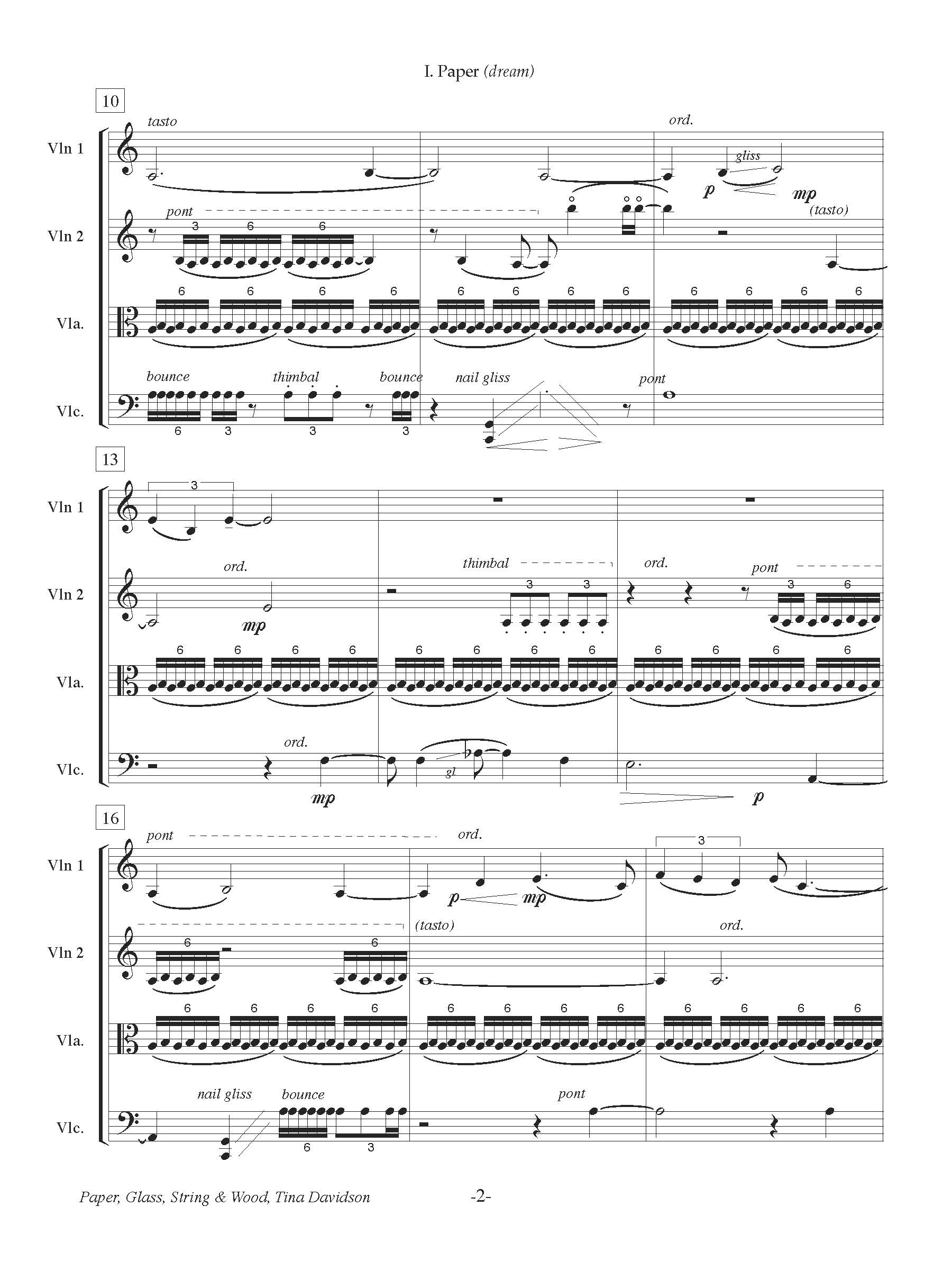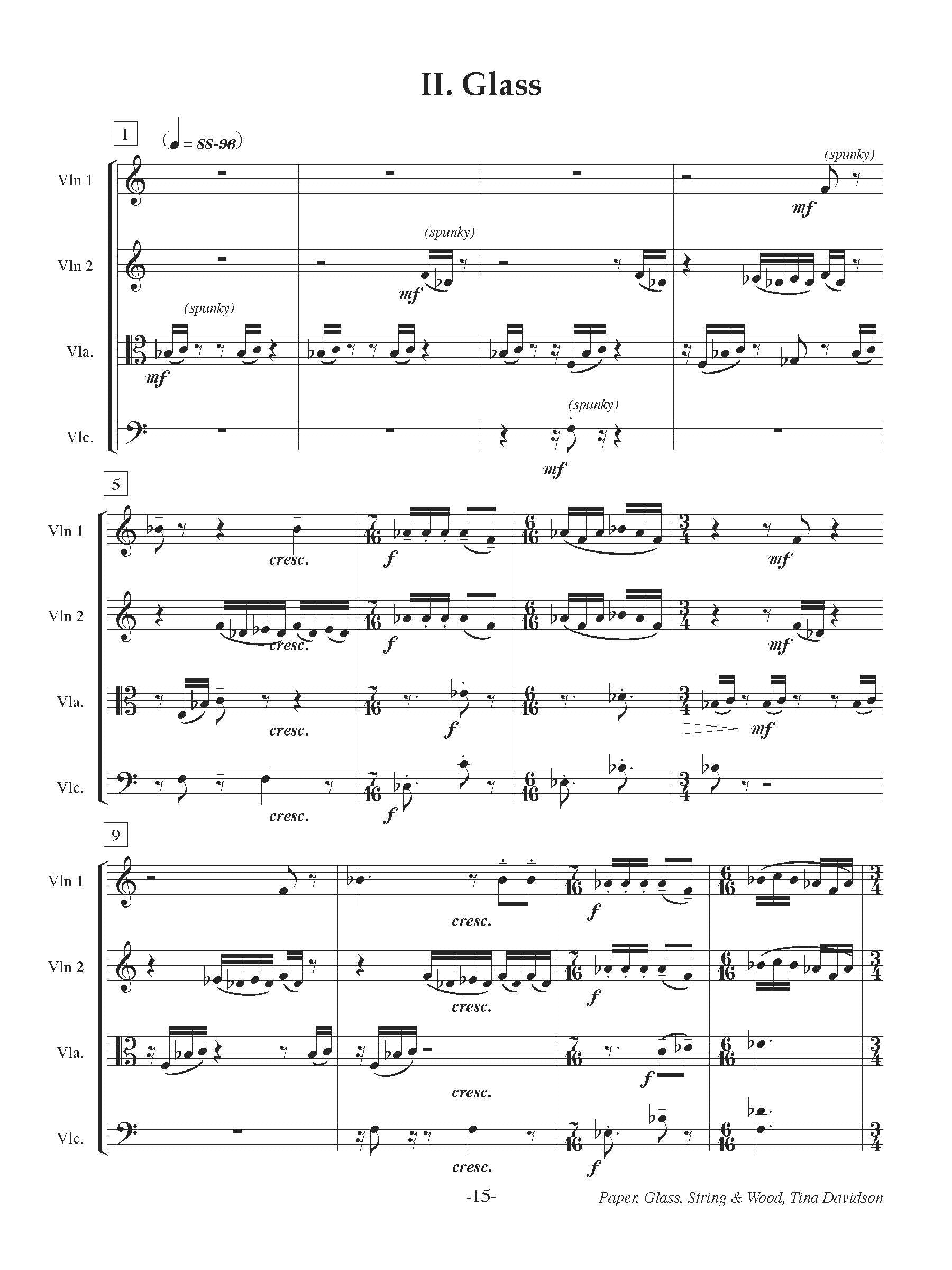 Paper, Glass, String & Wood was written as part of Tina Davidson’s third year as “Composer in the Community” for the Fleisher Art Memorial.  Commissioned for the members of The Philadelphia Orchestra, this work is scored for triple string quartet – a professional quartet and two student quartets, one advanced and the other intermediate.