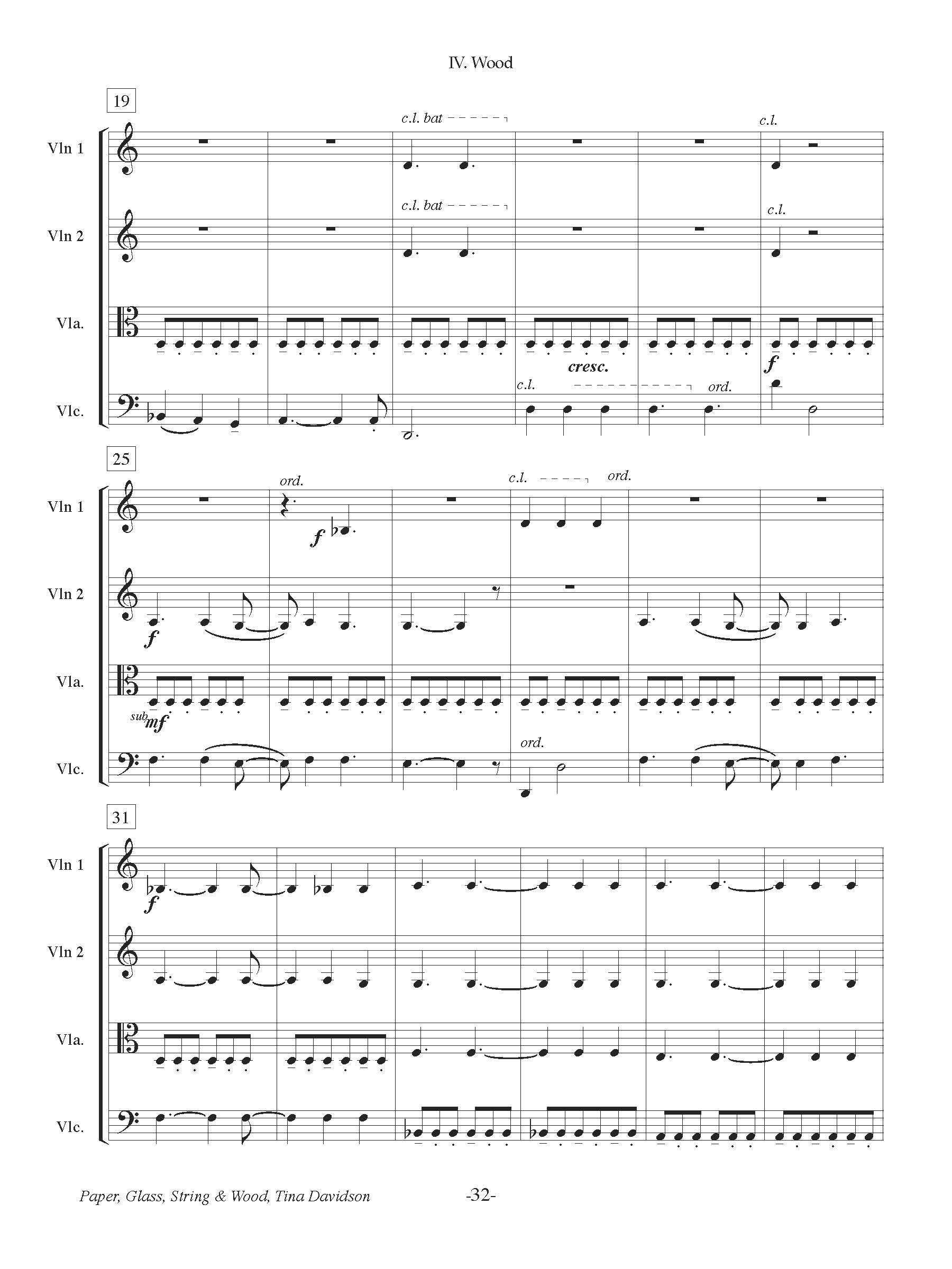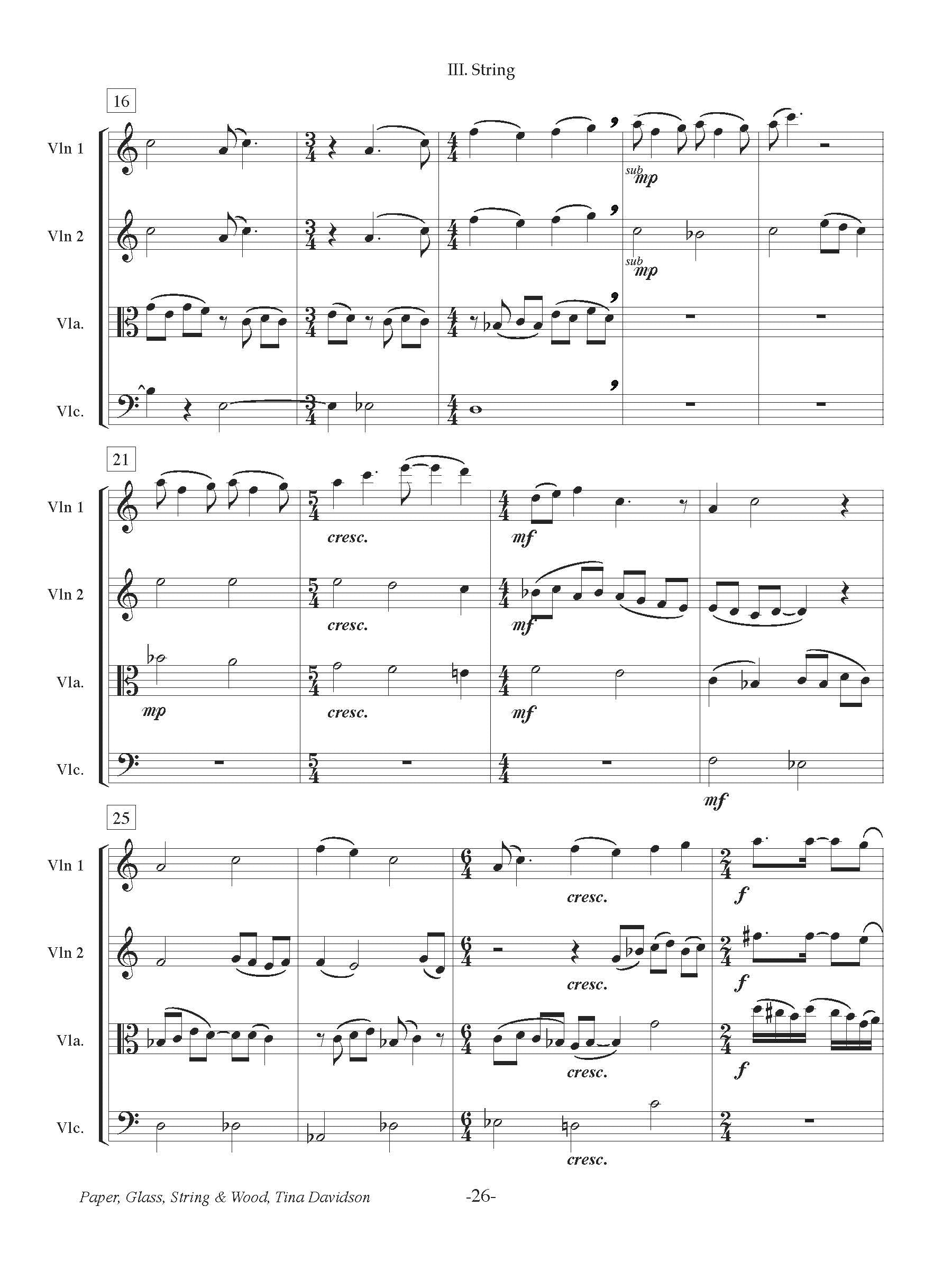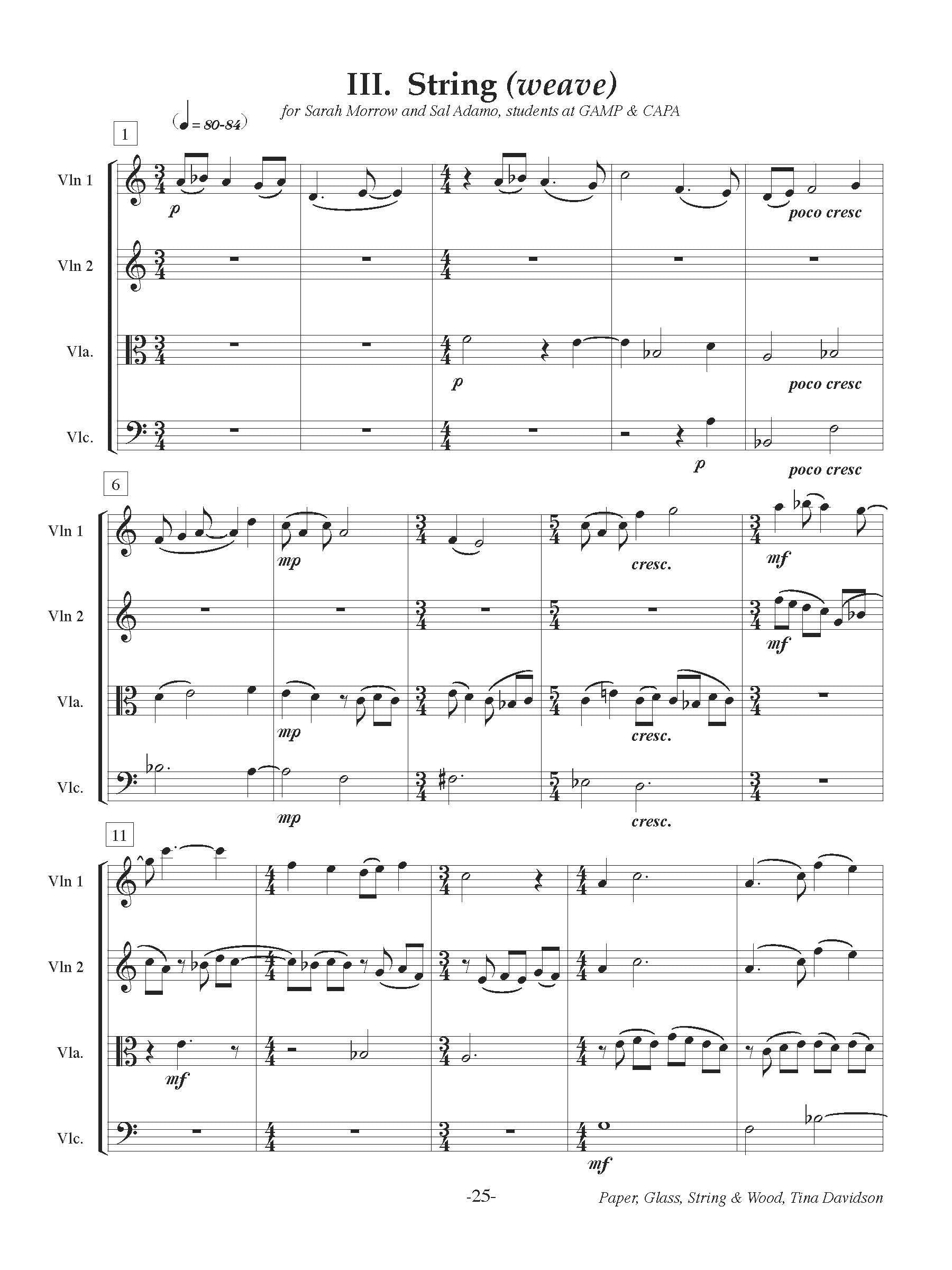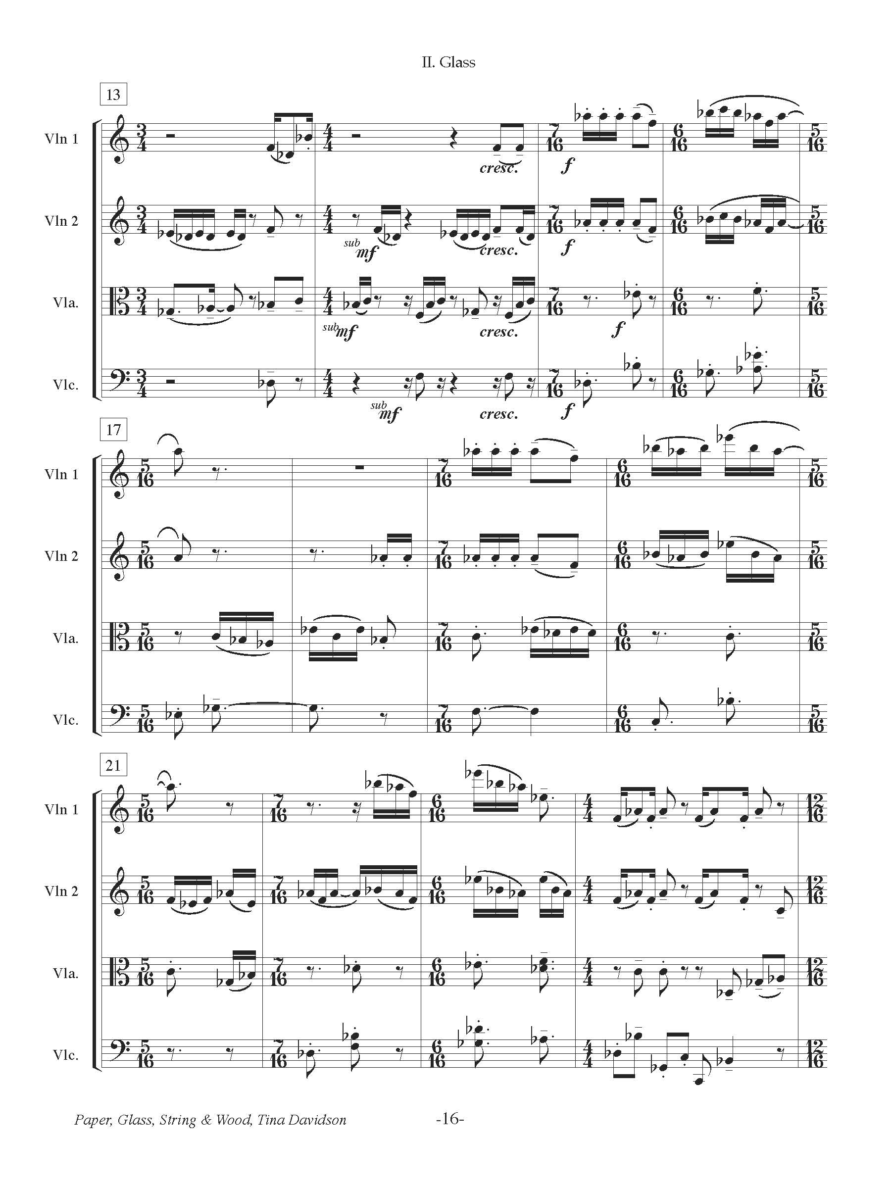 Paper, Glass, String & Wood was written as part of Tina Davidson’s third year as “Composer in the Community” for the Fleisher Art Memorial.  Commissioned for the members of The Philadelphia Orchestra, this work is scored for triple string quartet – a professional quartet and two student quartets, one advanced and the other intermediate.