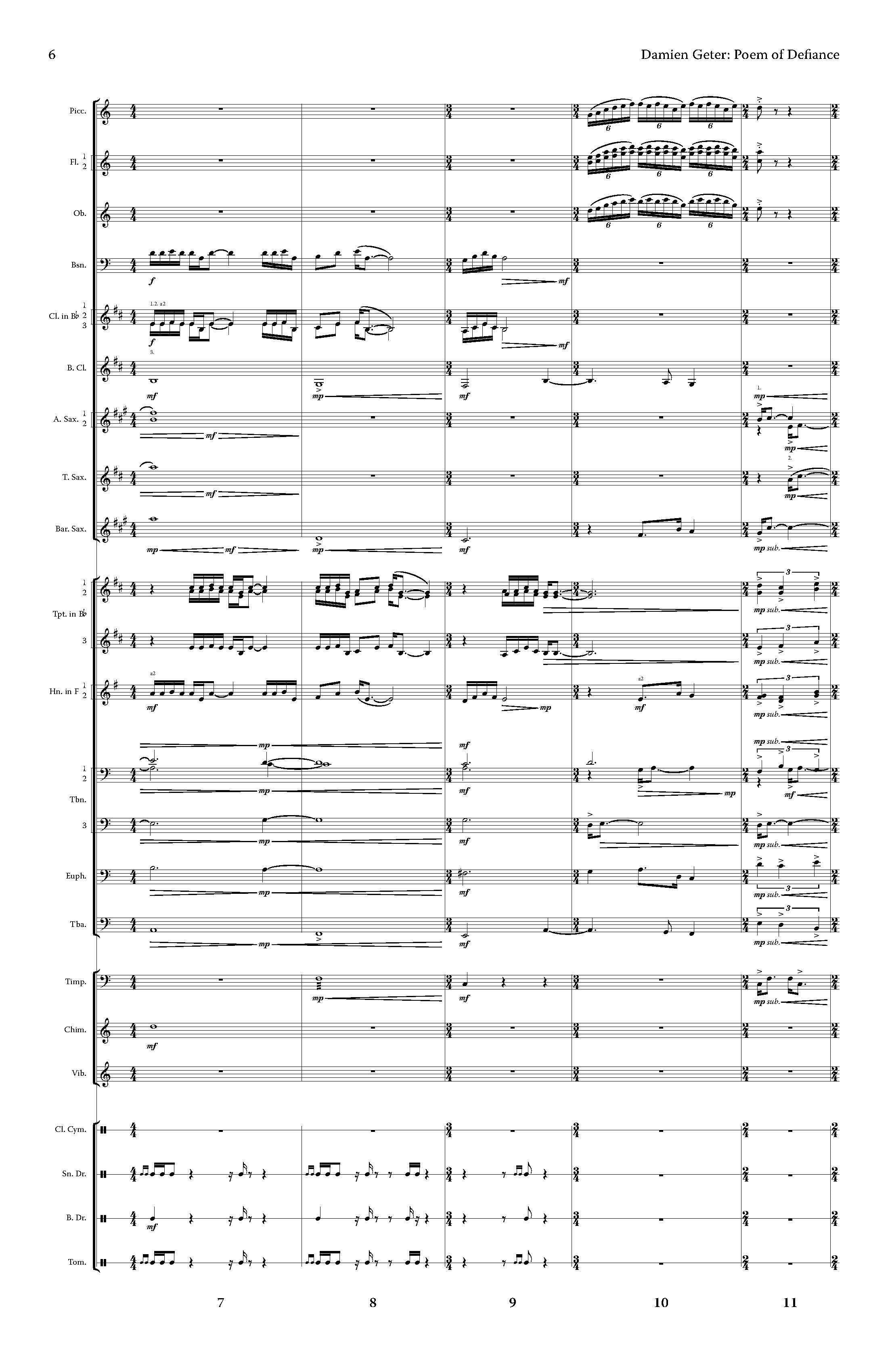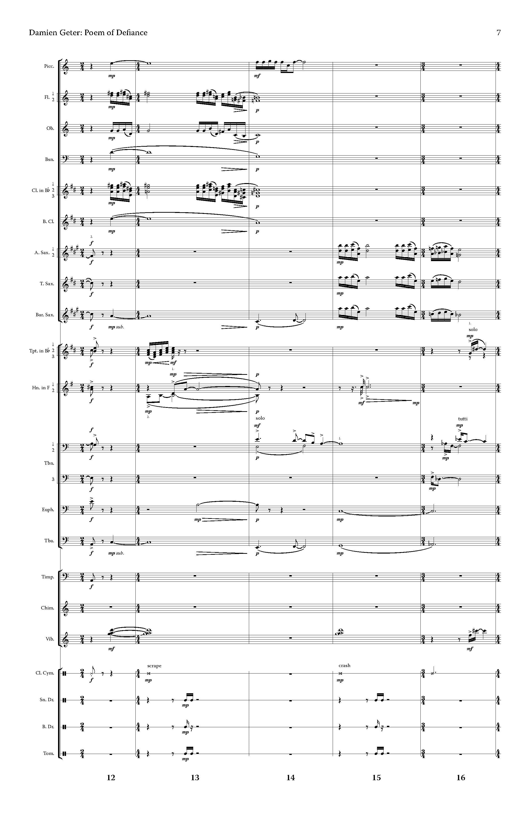 Poem of Defiance is a musical portrayal of tenacity, resilience, and unwavering strength in the face of adversity. The driving, powerful energy of the piece embodies the courage to confront and overcome life’s obstacles. There’s a heroic quality throughout — evoking the spirit of a champion within us all, one who faces fear, challenges injustice, and stands firm for what is right. The piece should be performed with a strong marcato articulation throughout, maintaining a sense of determination even in the slower, more lyrical sections, which should still be played with conviction and purpose.