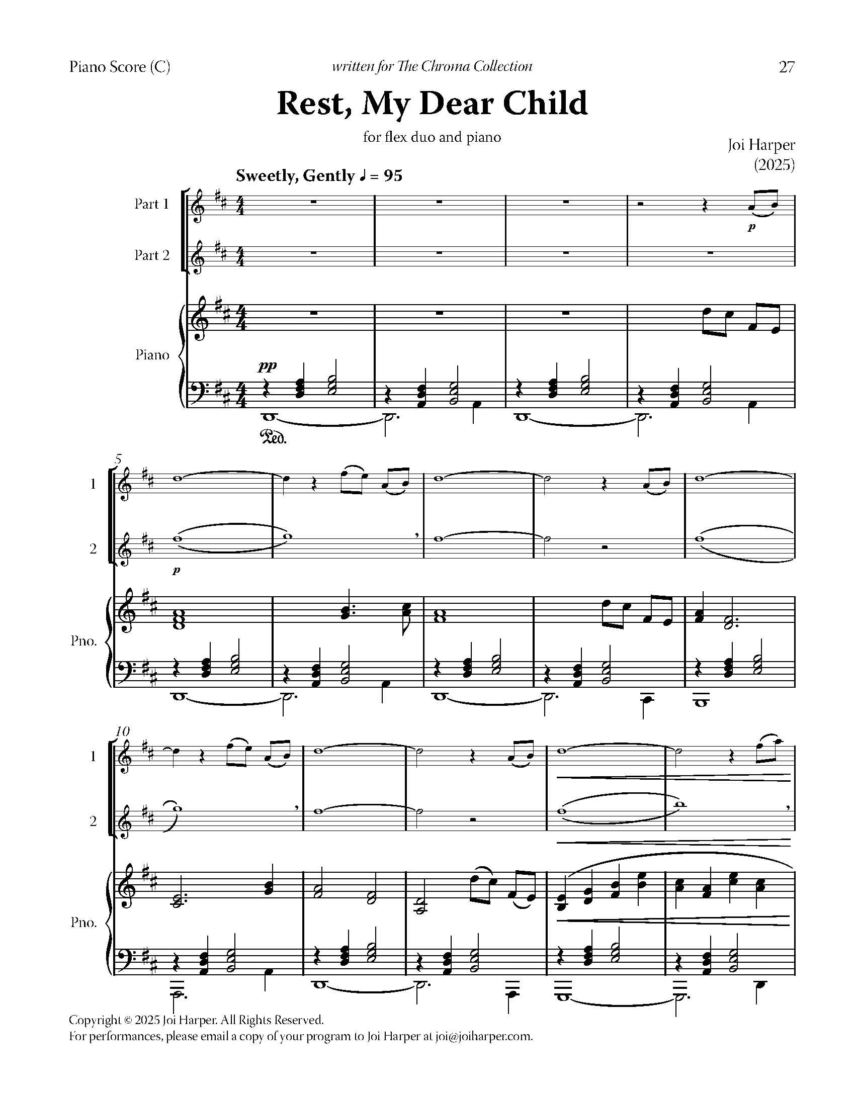 The Chroma Collection includes twelve new works by four incredible composers, each a mini collection by the composer. Exploring the intersections between music and art, the four composers in this book wrote “artcentric” pieces. With this being a flex book, the whole goal was to create a book where performers of different instruments could easily perform together - with this collection, a trumpet player can play a duet with their saxophone friend, a hornist can play with oboe, and what’s not to love about a tuba and flute combo?!