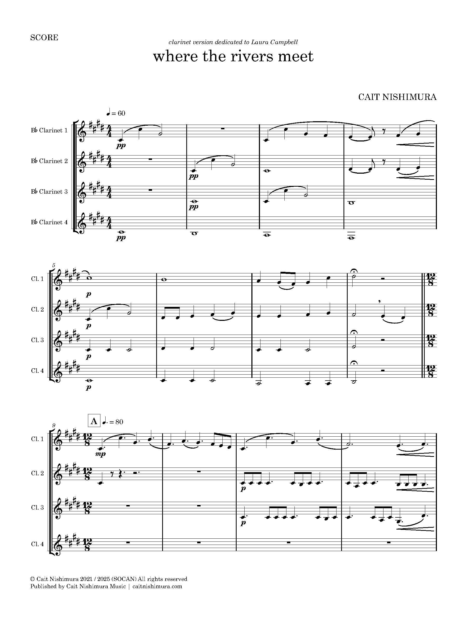 where the rivers meet is a short work originally written for four-part flute ensemble and arranged for four clarinets. The music depicts a place where two rivers connect and join each together, combining the waters of each. The water is always in motion, dancing and weaving around the curves of the river bed, reflecting colours and light as it moves. As each river flows, it carries with it the histories of all living things that interact with it, and when the rivers meet, all of these stories flow into each other to create a body of water even more beautiful and powerful.